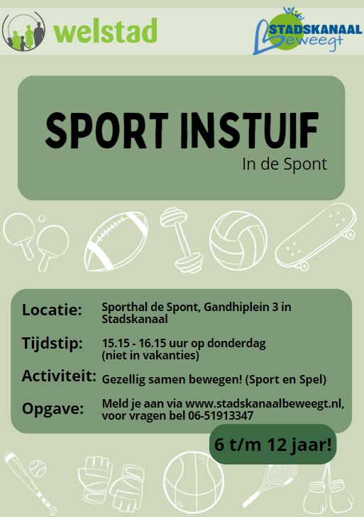 Iedere donderdagmiddag in Stadskanaal, sportinstuif in de Spont! Elke donderdag is er een sportinstuif in Stadskanaal voor de leeftijdsgroep 6 - 12 jaar. Tijdens deze sportinstuif worden verschillende sport- en spelactiviteiten georganiseerd door de Buurtwerker Sport Stadskanaal.
