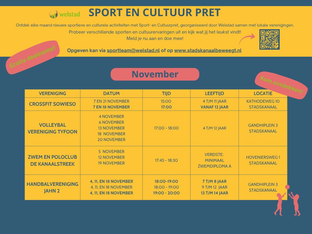 Kom tijdens de maand november weer sporten bij verschillende verenigingen. Tijdens sport en cultuurpret stellen verenigingen hun training open, zodat de inwoners kunnen ervaren wat het beste bij een ieder past.